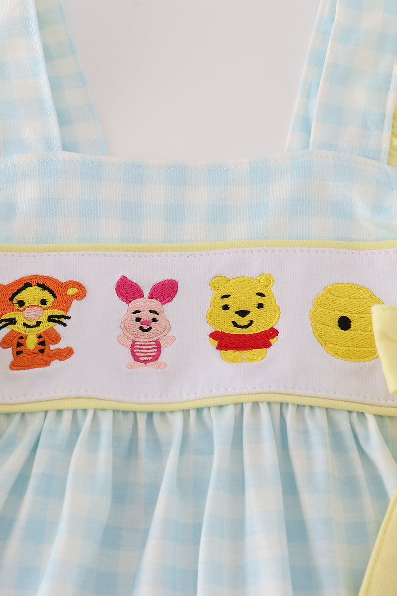 Blue character embroidery gingham ruffle dress