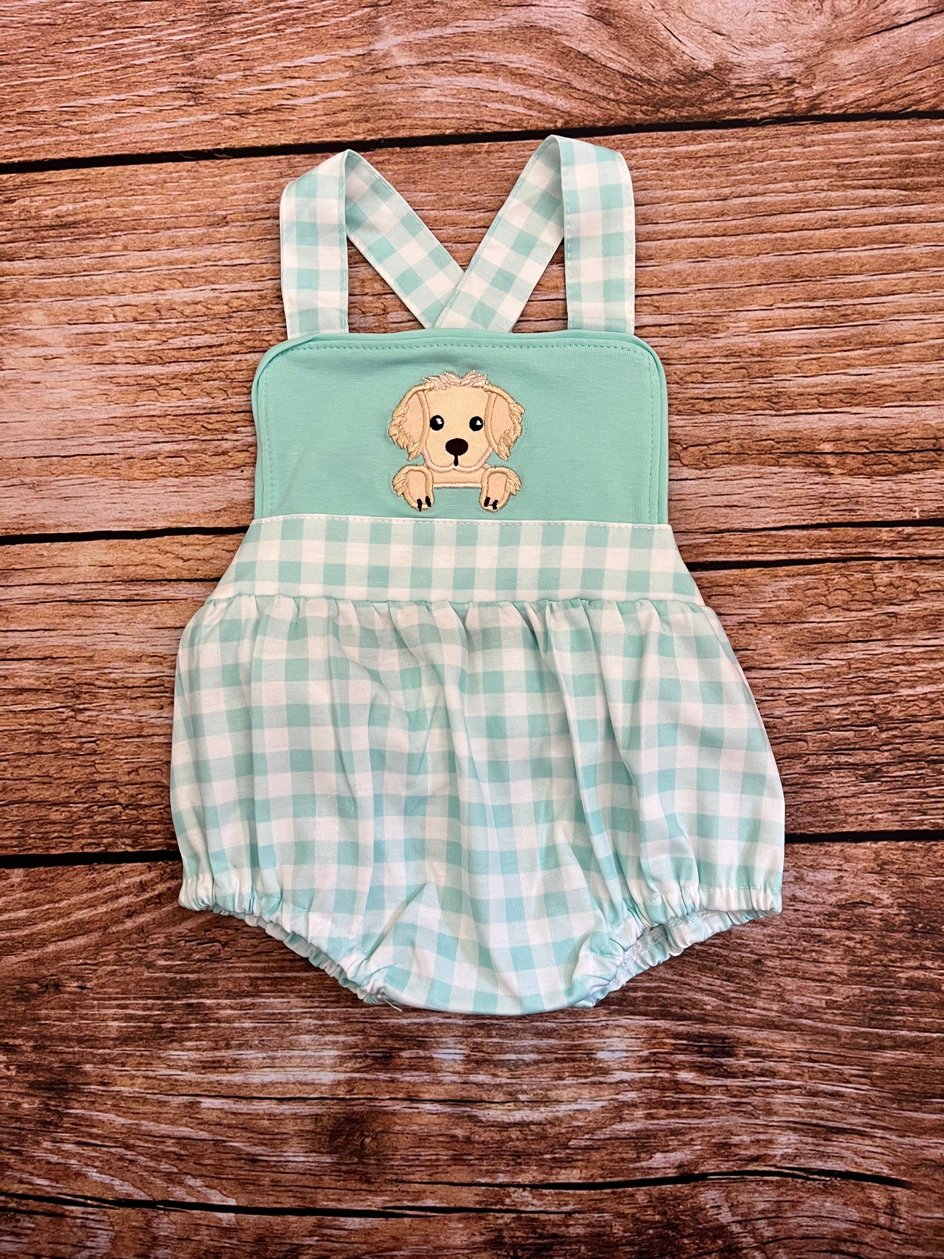 Adorning the front is an adorable puppy appliqué in coordinating colors, bringing a playful and whimsical element to the outfit. The cheerful puppy design is sure to capture hearts and spark joy wherever your little one goes.