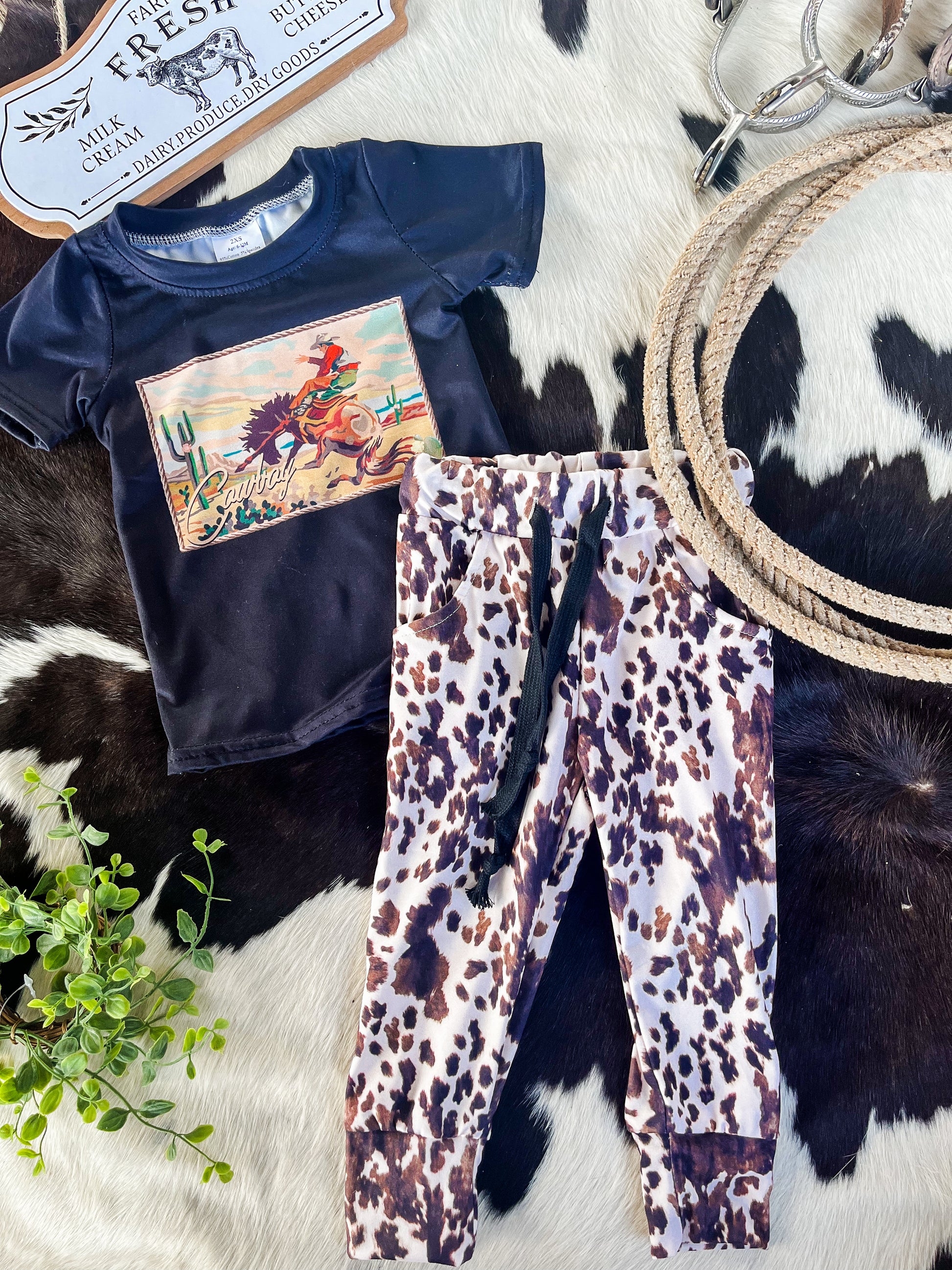 The cowhide print joggers add a fun and stylish element, perfect for young cowboys and cowgirls who love to explore and play.