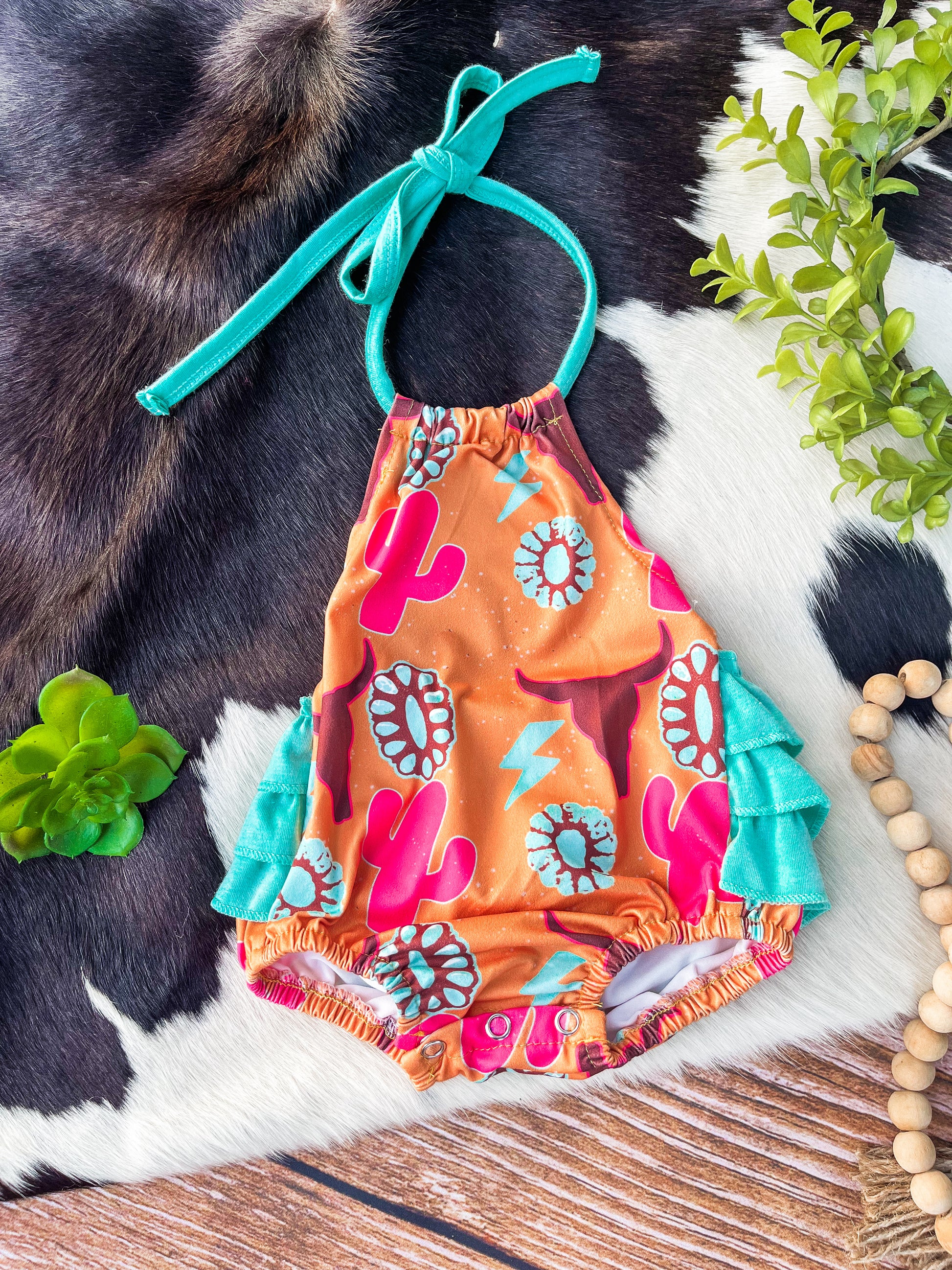 Dress your little one in Southwestern charm with our Bull Skull Turquoise Ruffle Bubble, a delightful ensemble that blends whimsy with a touch of Western flair.