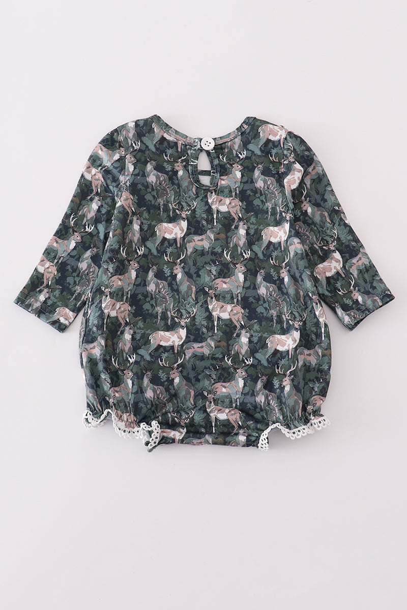 Get ready for outdoor adventures with this playful camouflage hunting deer applique ruffle bubble! Featuring a charming deer design and cute ruffle details, it adds a fun twist to classic camo style. Comfortable and stylish, it's perfect for young explorers who want to blend in while standing out.