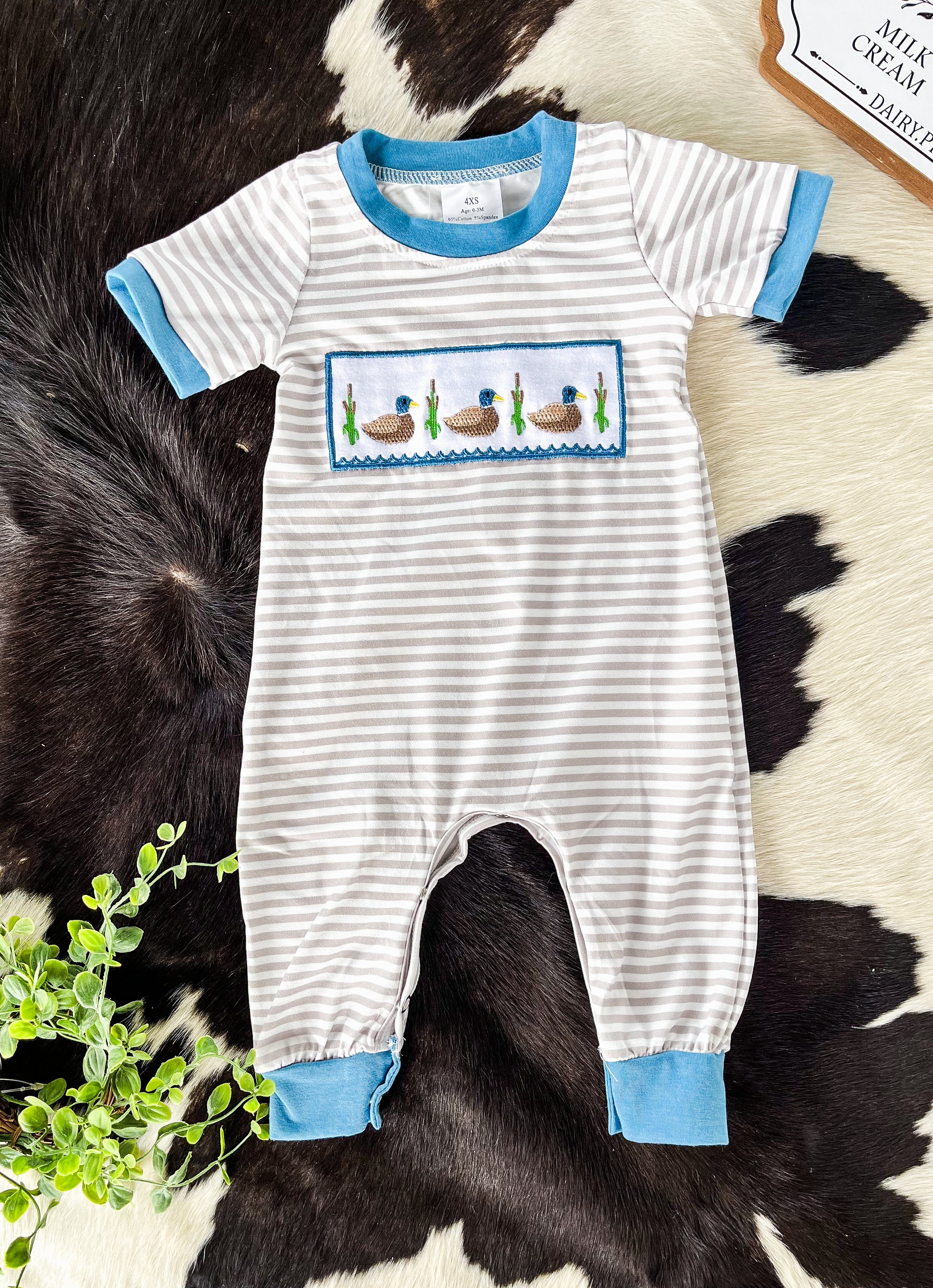Applique Stripe Duck Romper, a charming outfit designed for the little hunter in the making. This adorable romper features a playful duck applique against classic stripes, blending outdoor charm with stylish comfort.
