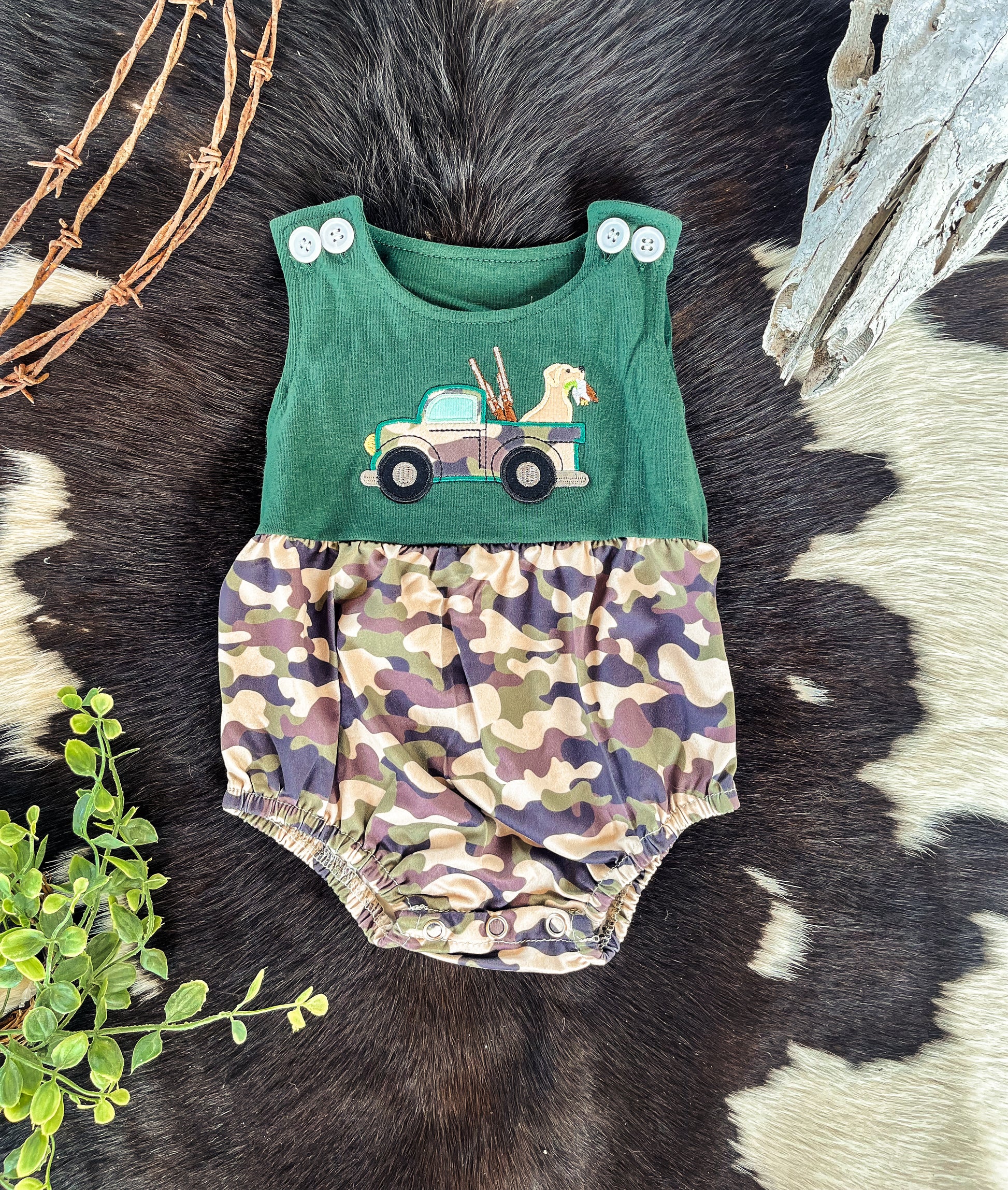 This bubble is a rugged and adorable choice for your little adventurer. This unique bubble outfit features a classic green hunting camouflage print, perfect for outdoor enthusiasts in training.
