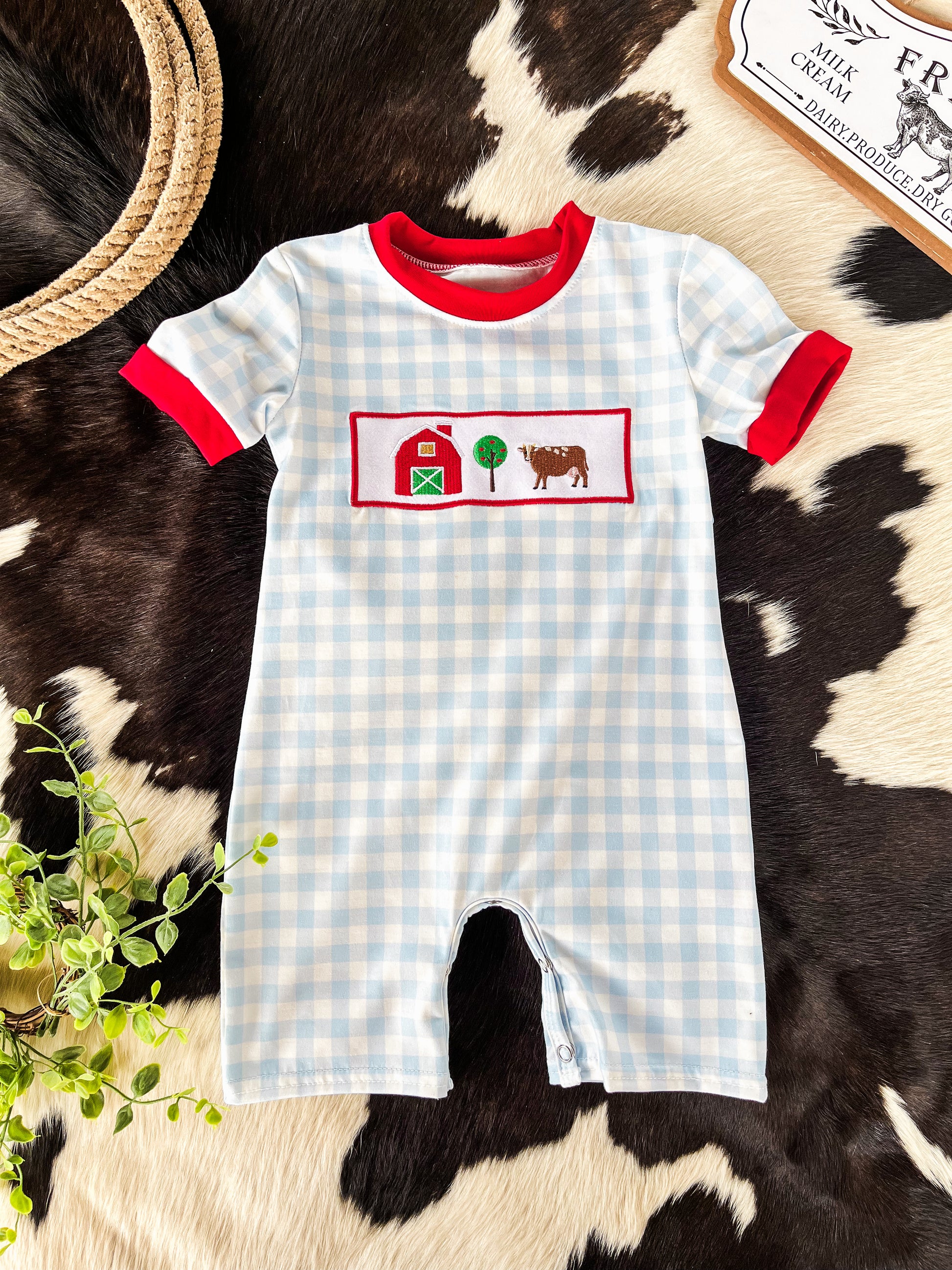 Light Blue Gingham Farm Romper with Red Detailing, a charming and rustic outfit perfect for your little adventurer. This adorable romper features a classic light blue gingham pattern, evoking a sense of rural charm and simplicity.