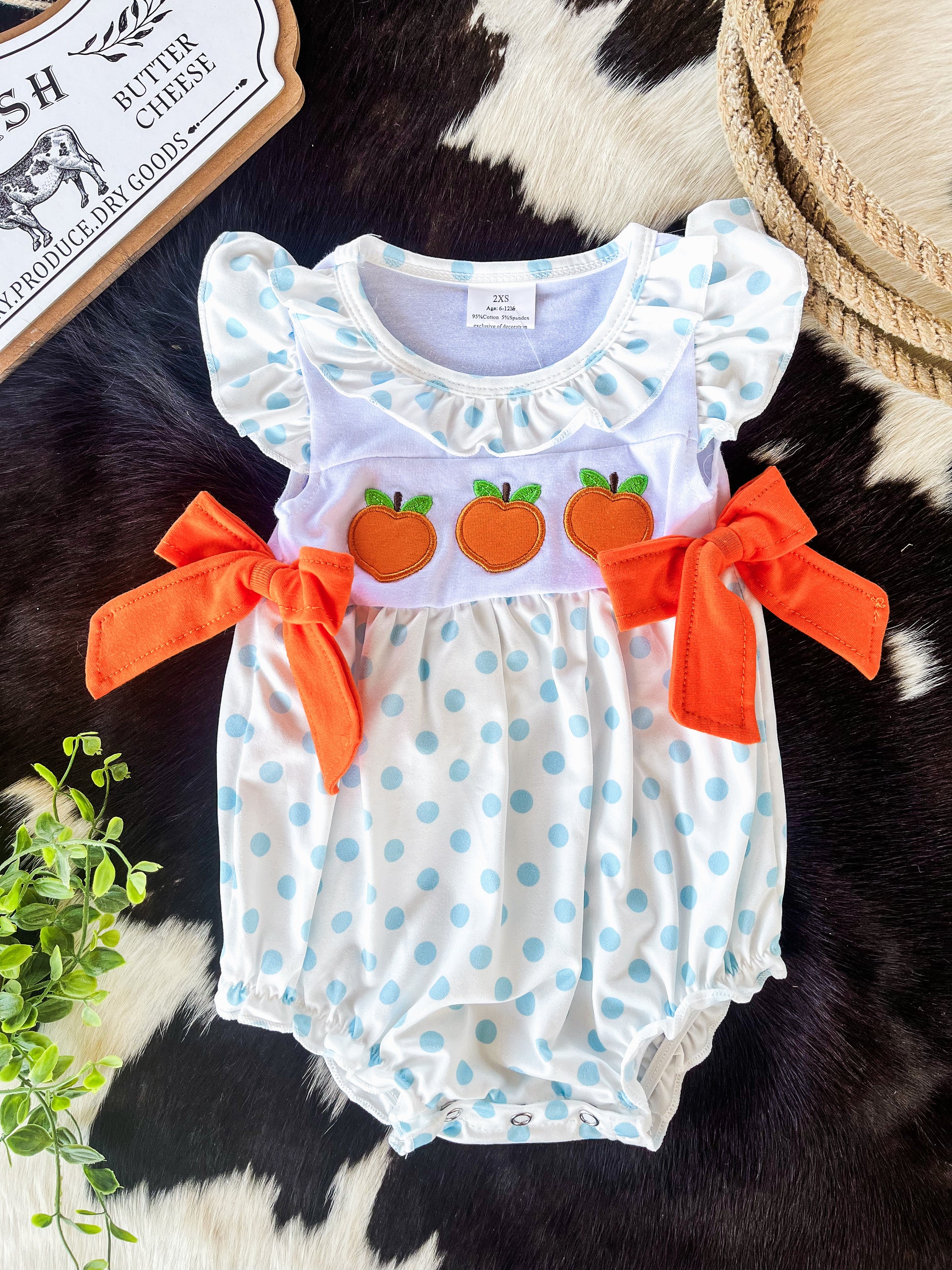The highlight of this ensemble is the peach applique adorned with intricate detailing, adding a touch of sweetness and charm. Two orange bows on either side enhance the outfit's playful appeal, adding a pop of color and style.