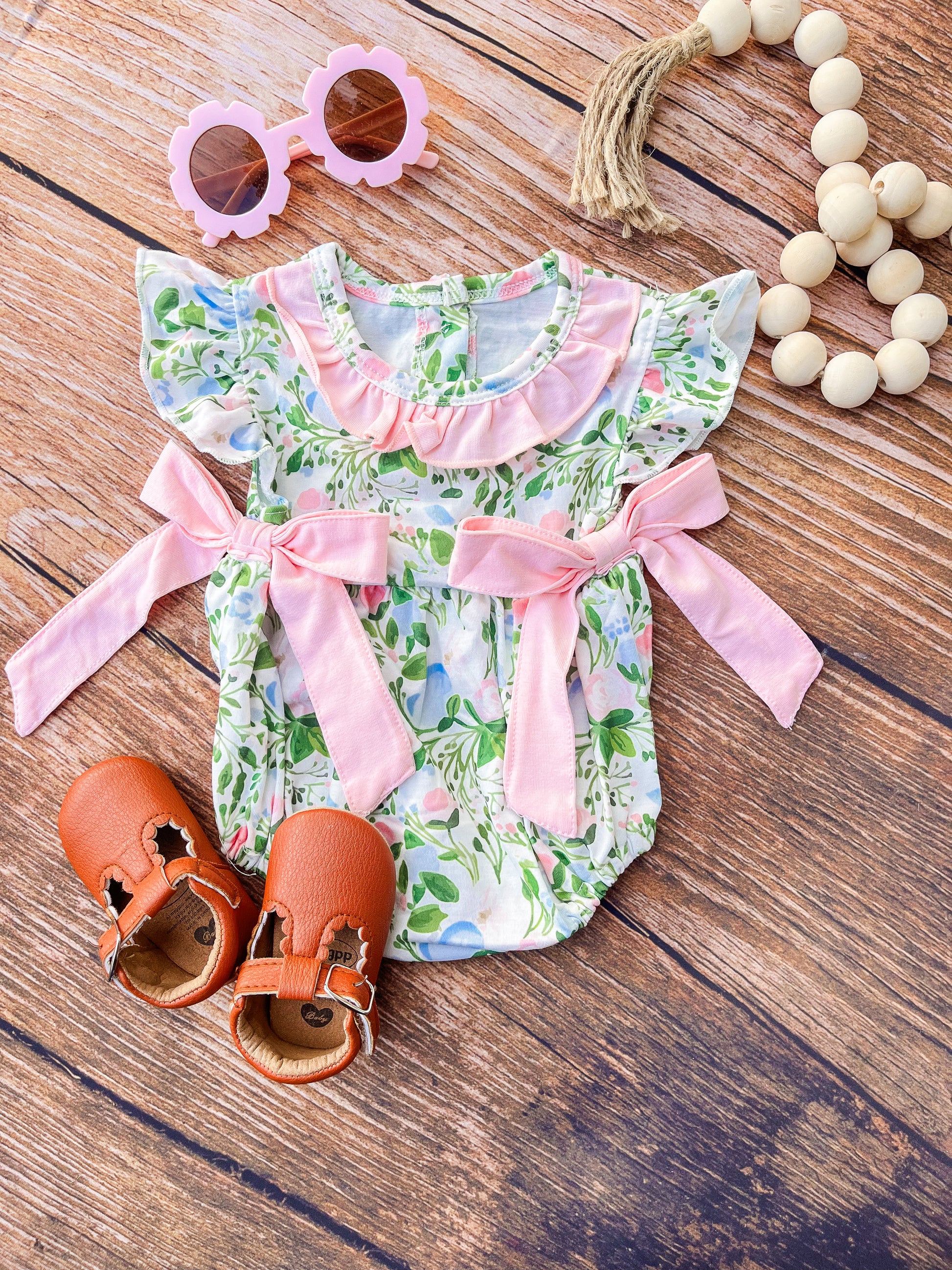 Green Floral Bubble with pink ruffle and bows, a delightful and stylish choice for your little one. This adorable bubble features a charming green floral print that exudes freshness and whimsy, perfect for sunny days and special occasions alike.
