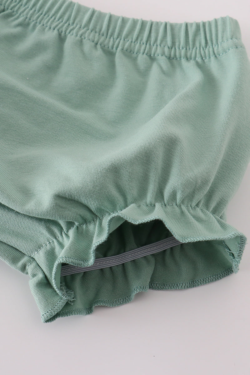 Dress your little one in charm with this green floral pumpkin embroidery smocked bloomer set. The delicate pumpkin embroidery adds a whimsical touch, while the smocked design ensures a comfy, snug fit. Perfect for playful days and cozy moments, this set brings a fresh, festive vibe to any wardrobe.