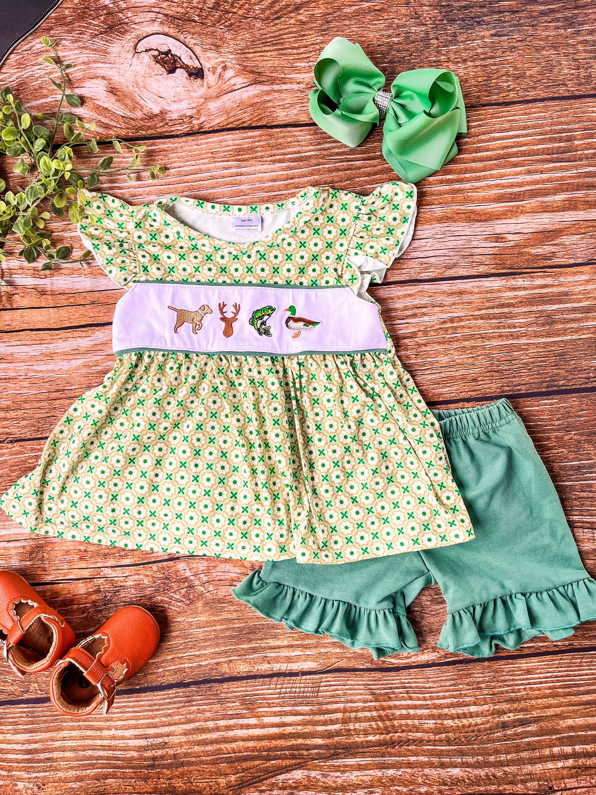 Paired with the shorts is a hunting green patterned top, adorned with playful motifs that evoke a sense of adventure.