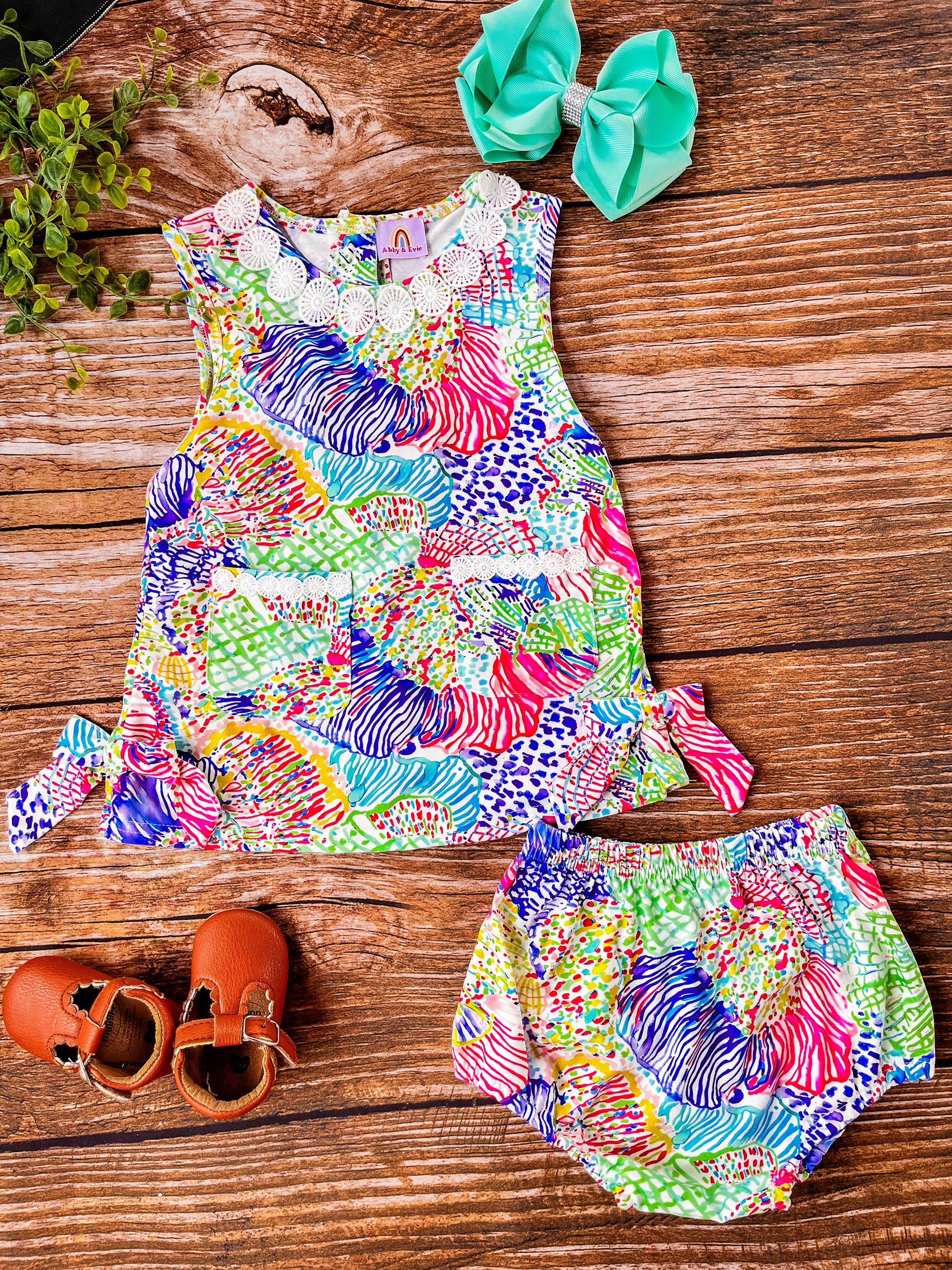 This adorable bloomer set features a variety of vibrant colors and playful patterns, creating a lively and joyful look.