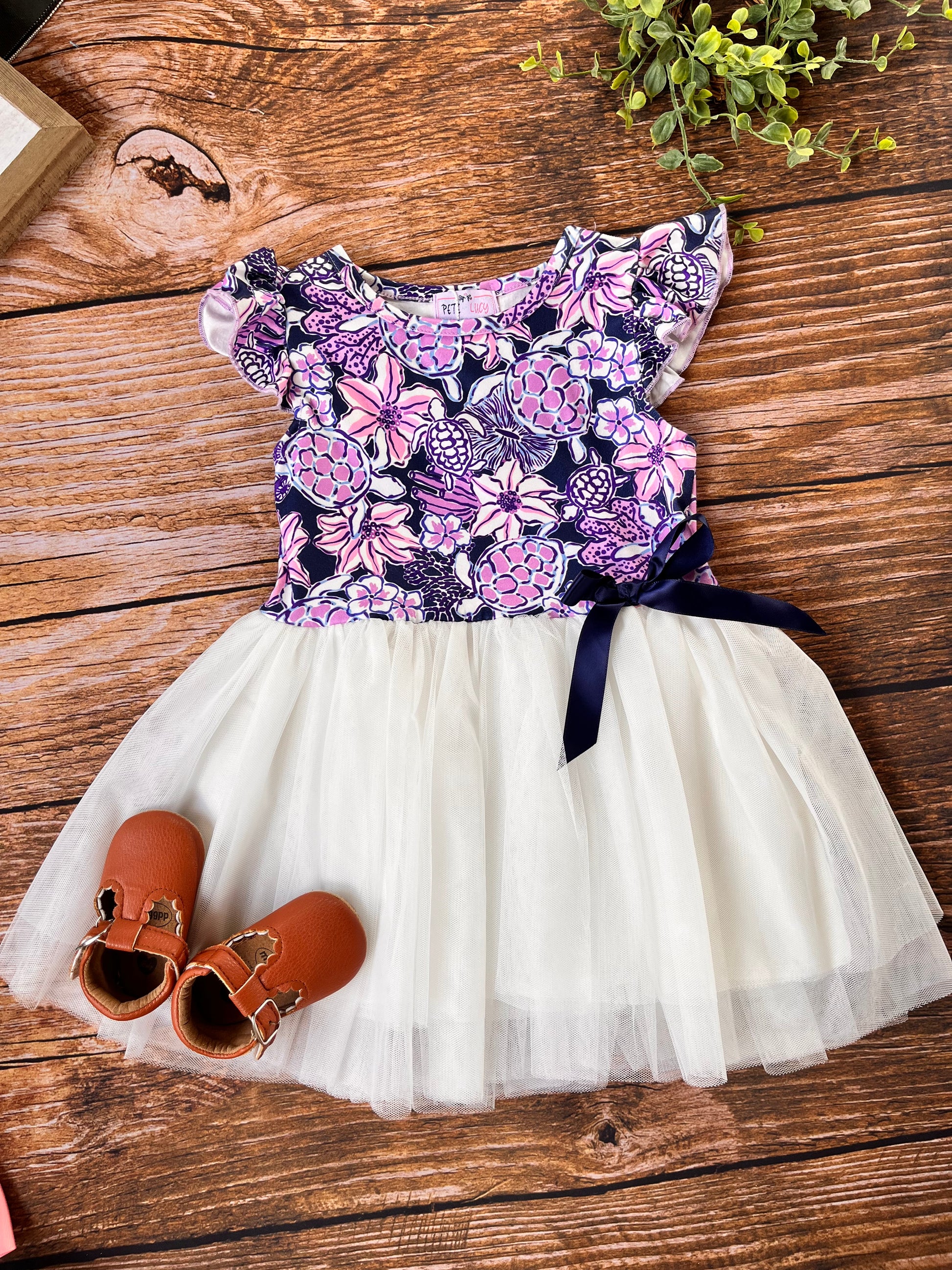 This lovely dress features a rich purple color adorned with delicate floral patterns, enhancing its beauty and charm.