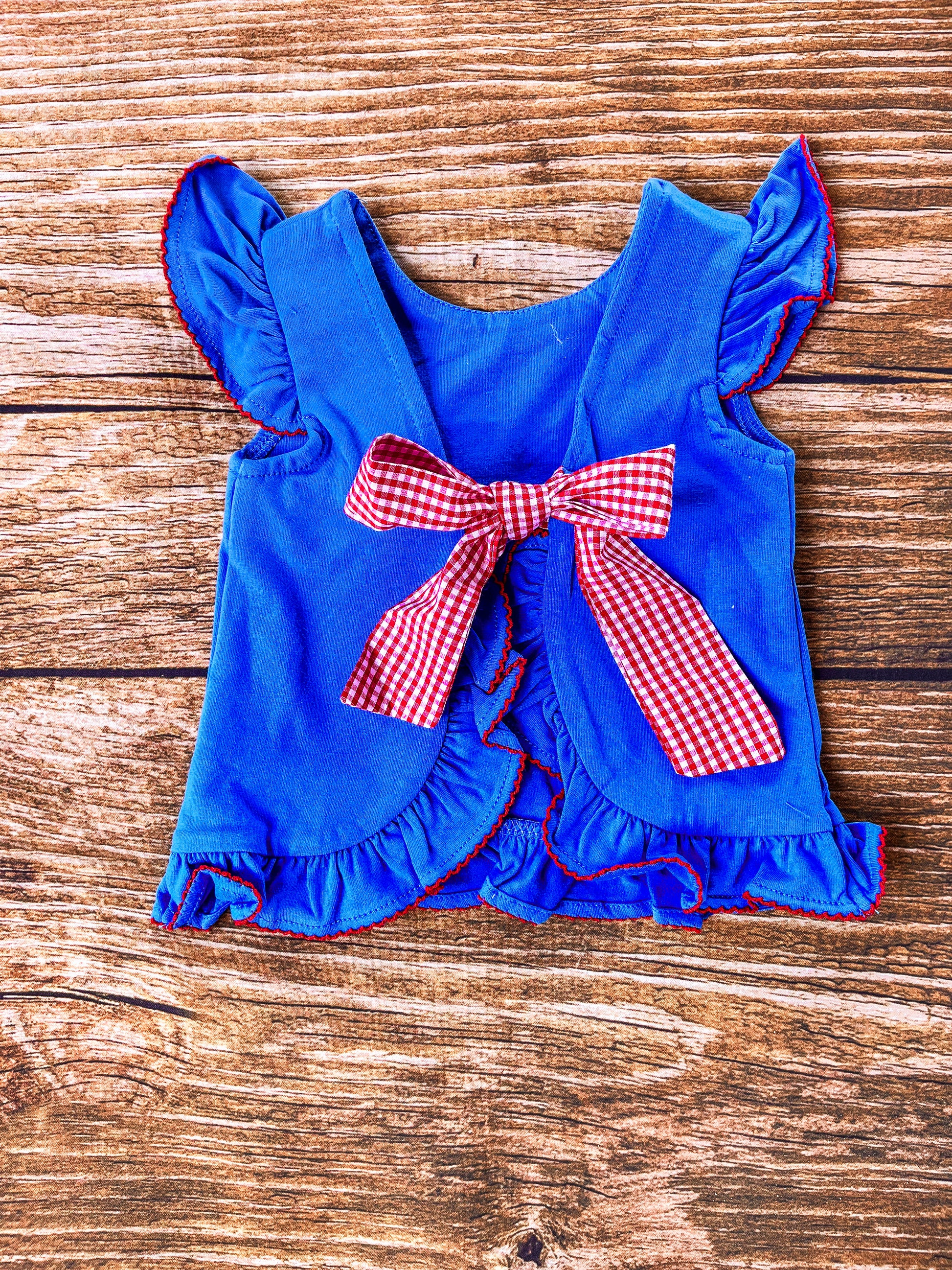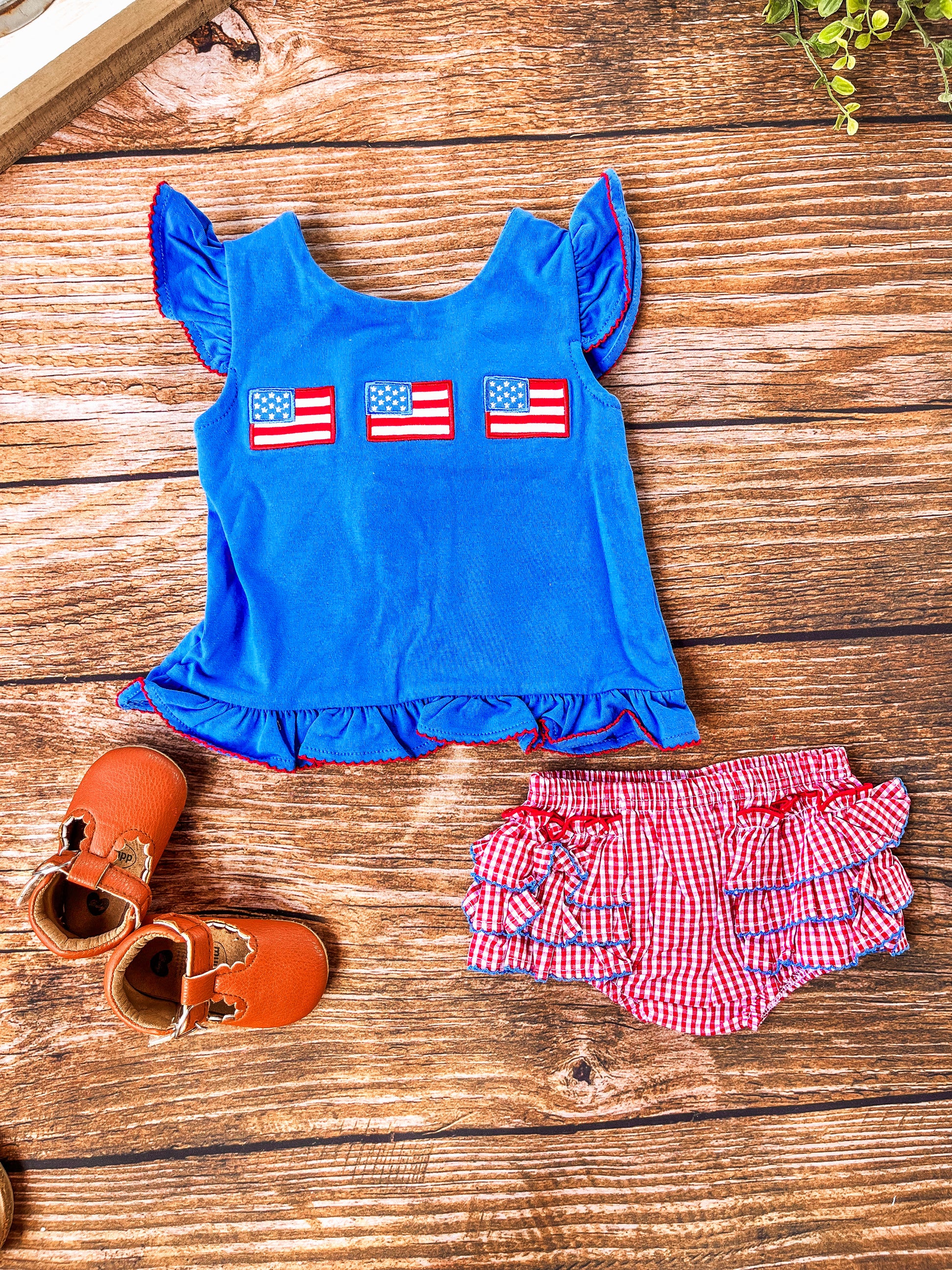 Patriotic flag ruffle tie back with a charming ruffle bloomer.