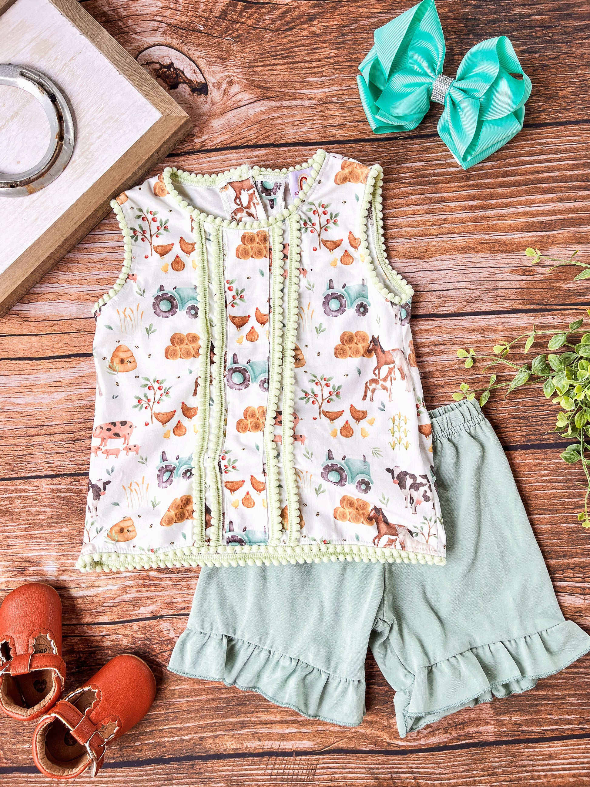 Introducing the farmer hay sage green short set, a charming and countryside-inspired ensemble designed for your little girl's outdoor adventures.