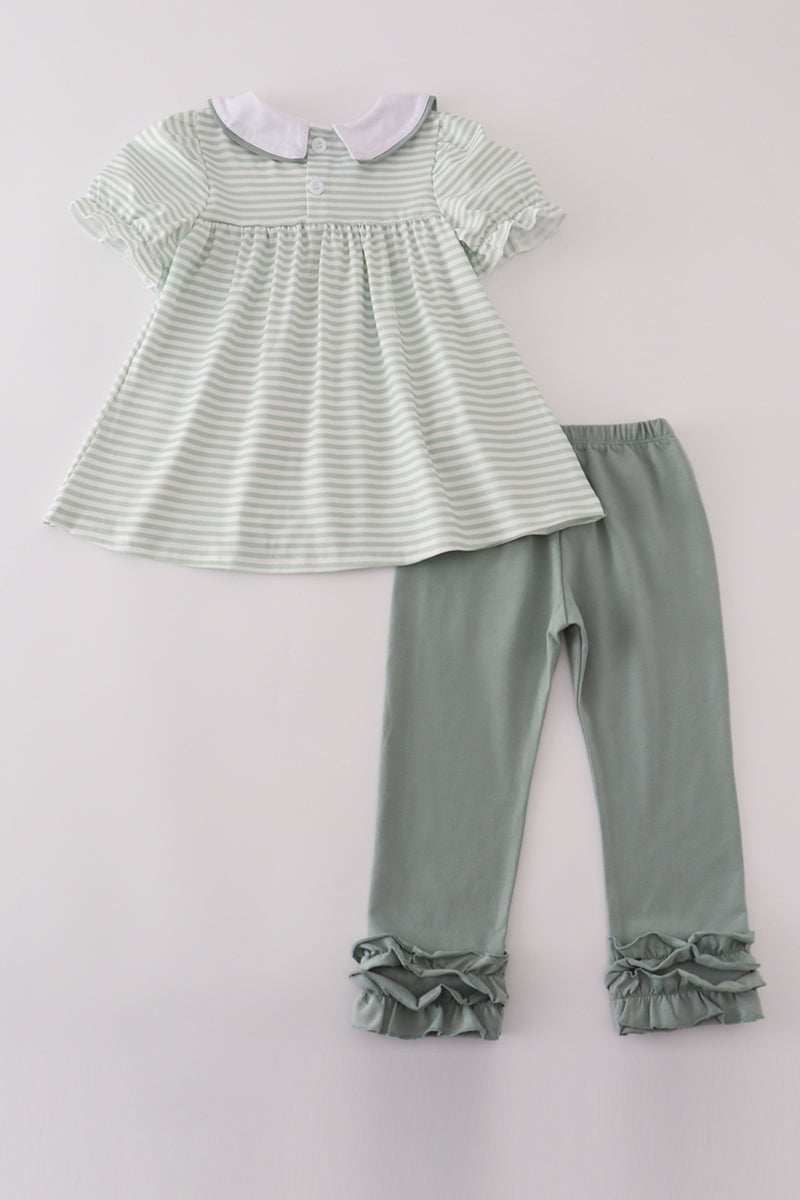 Add a touch of whimsy to your wardrobe with the Sage Stripe French Knot Ruffle Pants Set. Featuring charming ruffle details and a delicate French knot pattern, this playful ensemble combines comfort and style effortlessly. Perfect for lounging or casual outings, it brings a fresh, fun vibe to your everyday look.