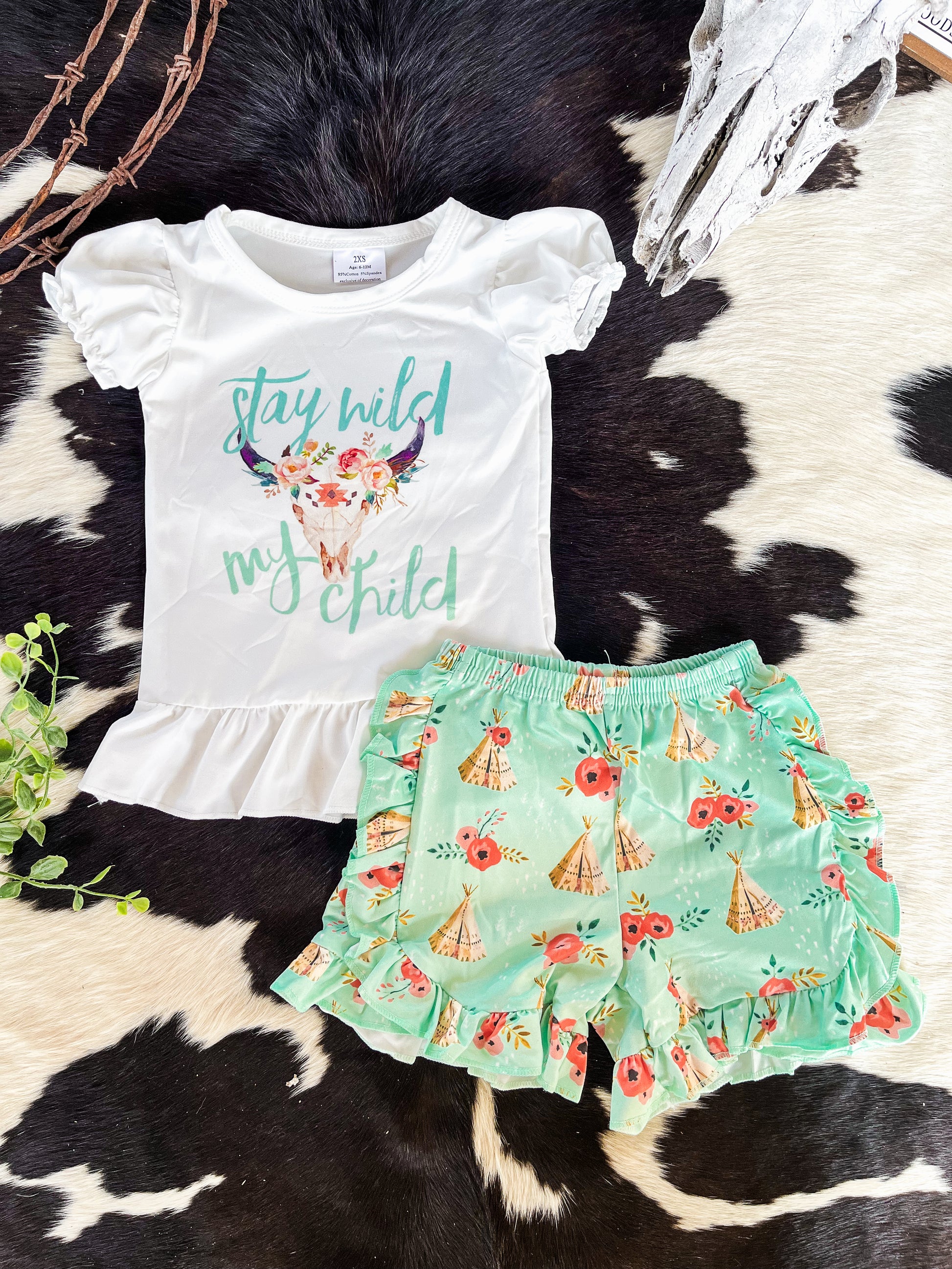 "Stay Wild, My Child", embodying the adventurous spirit of childhood exploration. Adorning the top is a floral cow skull design, adding a rustic and whimsical touch that celebrates a boho charm.