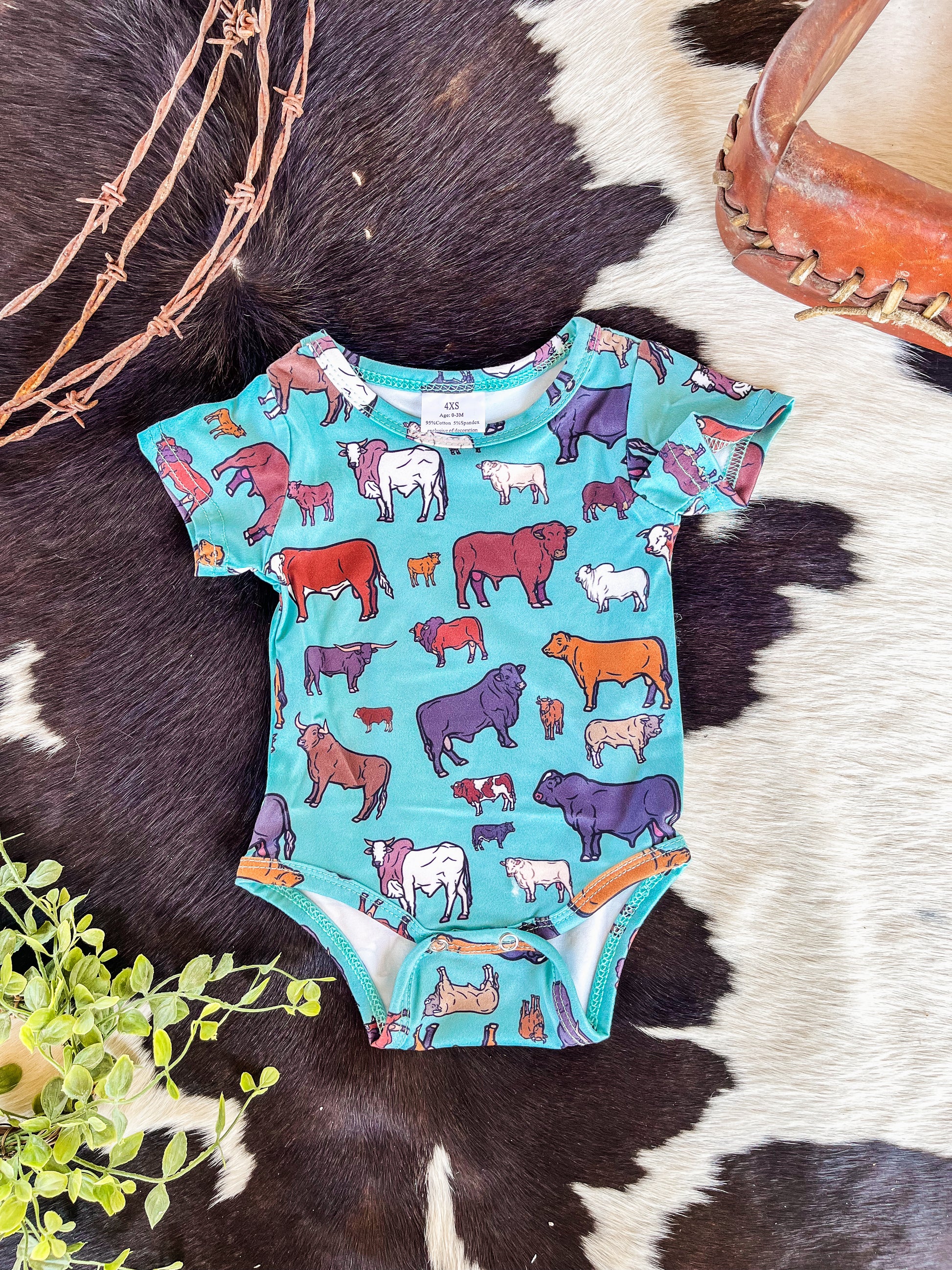 This adorable onesie features a print that showcases various types of cattle, including Brahman, Hereford, and other breeds, capturing the diversity and charm of ranch life.