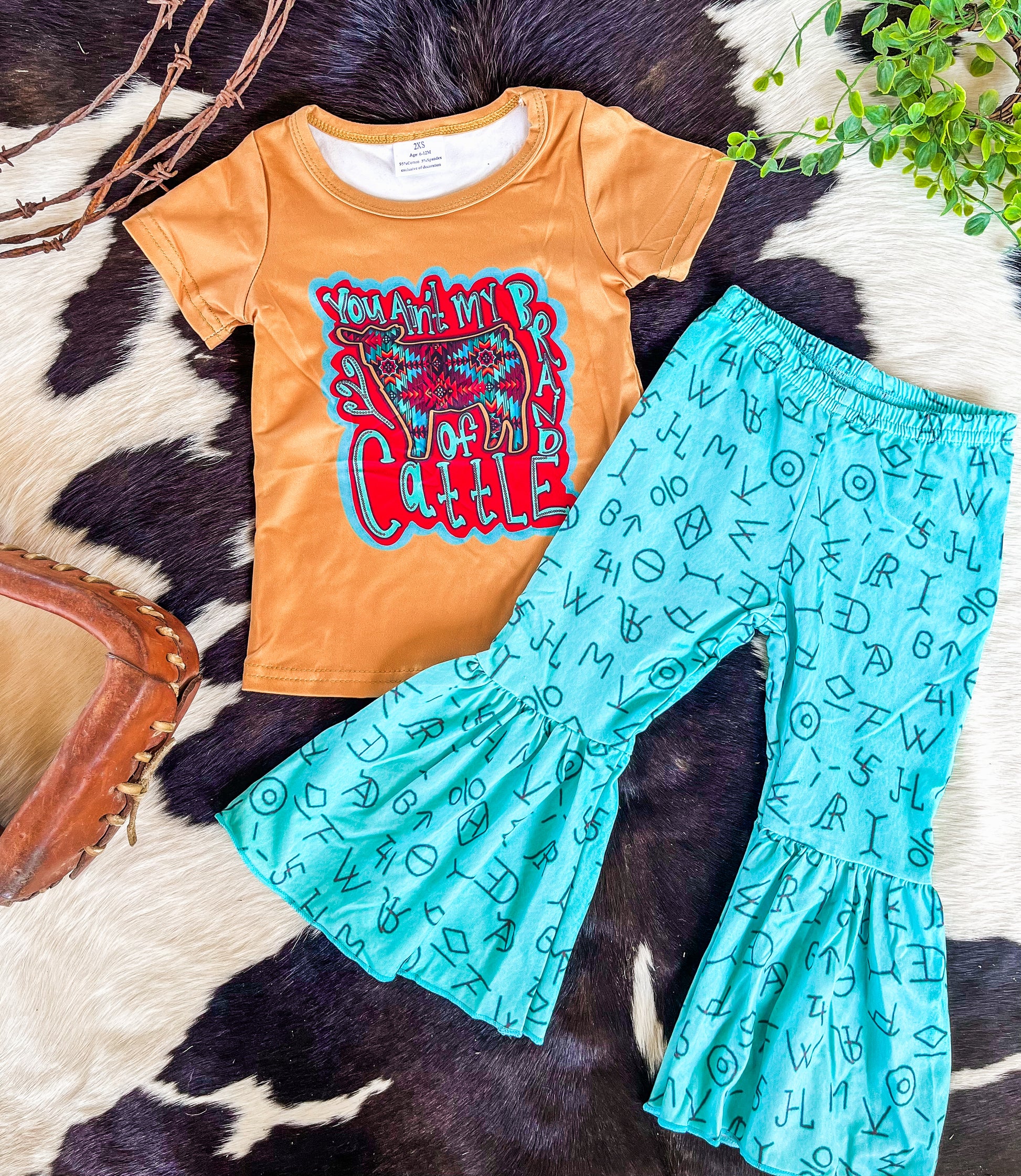 Complementing the shirt are turquoise bell bottoms adorned with different brands, adding a unique and stylish touch reminiscent of cattle branding in western culture.